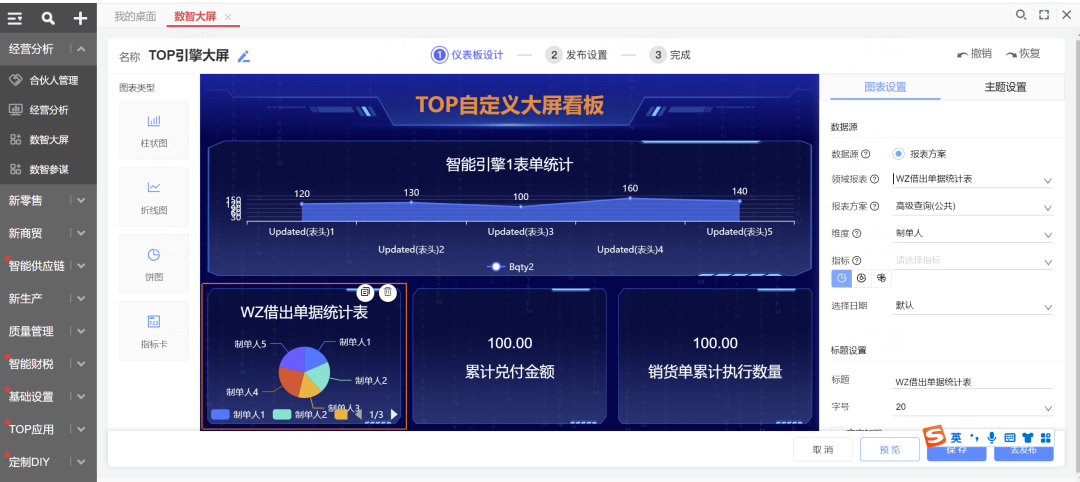 畅捷通TOP低代码平台 在这个数字化转型的时代,如何高效地利用数据成为企业竞争的关键。为了帮助企业更好地管理与展示关键业务信息,我们推出了畅捷通TOP低代码平台,它支持自定义数据源——将T+ERP库内的数据按需自由提取和加工形成的个性数据源,发布到数智大屏,为企业提供了一个强大的工具来优化决策流程、提高运营效率。 什么是数智大屏?